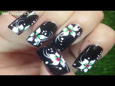 Nail Design Beauty | Nail Fashion Paint Idea | White Flowers On Black Background